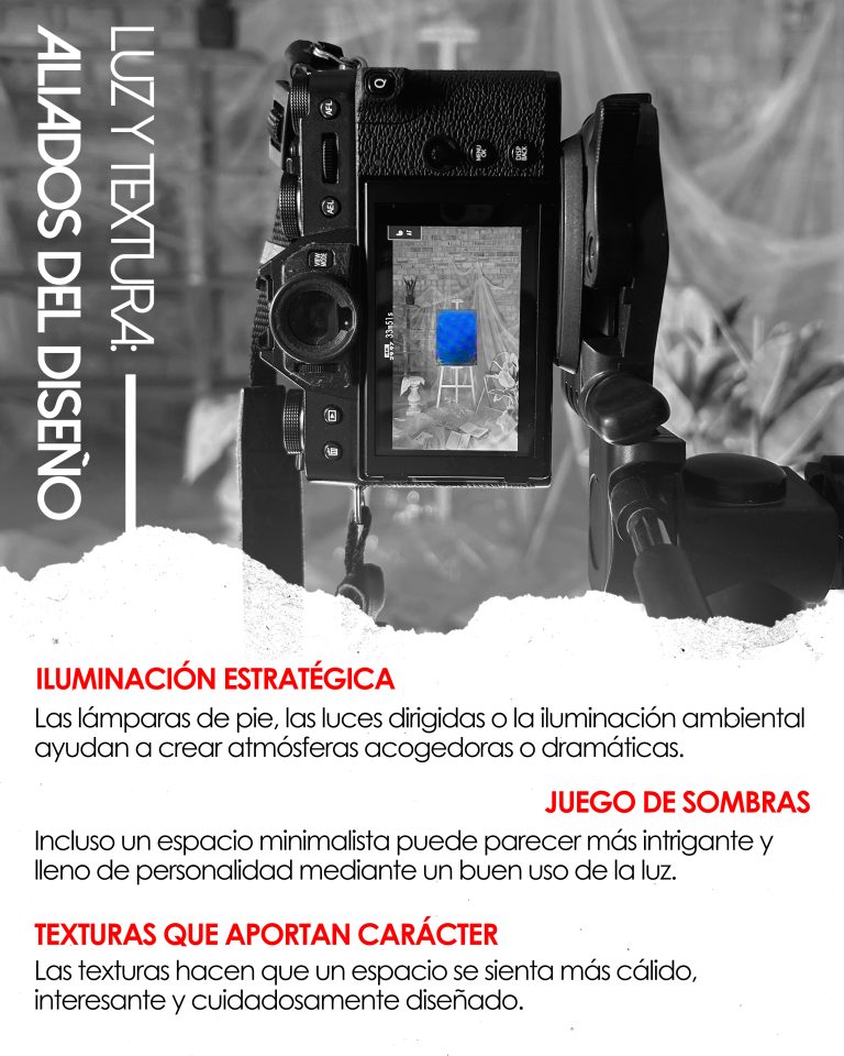 La luz y la textura son herramientas esenciales para dar vida a un espacio. La manera en que la luz incide sobre los materiales y cómo se perciben las texturas puede transformar por completo una habitación.